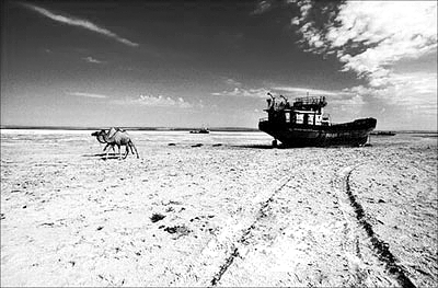 咸海变成沙漠:这个曾经是世界上第4大湖泊的淡水源,现在成了废船搁浅、骆驼散步的荒漠。(见右图)