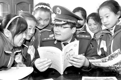 图为山东省潍坊市下营小学学生在夏店边防派出所民警叔叔指导下阅读书籍。近年来,学校和派出所开展了以“让阅读成为习惯”为主题的读书活动,民警叔叔向小朋友们赠送各种读物500多本。本报通讯员 高宁摄