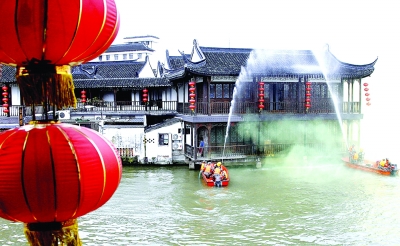 四月十三日,消防巡逻冲锋舟对发生“火情”的古镇老宅迅速“扑救”。当日,上海市的千年古镇朱家角举行全民参与的应急消防综合演练,朱家角古镇地处上海与江苏、浙江两省接壤之地,是进出沪上的水陆西大门。世博会期间,预计将有七百多万中外游客到朱家角古镇观光。新华社记者 陈飞摄