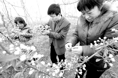 | 4月14日,山西运城几名农科人员在果园察看梨树冻害情况。连日来的低温、雨雪天气造成山西运城大面积农作物和果木经济林严重冻害,当地政府迅速采取措施,组织各职能部门积极应对低温,展开抗冻减灾工作。 新华社发(卫行智摄) |