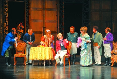 | 4月14日,著名表演艺术家焦晃(左四)在演出中。当晚,国家大剧院夏季演出季戏剧场开幕大戏——话剧《钦差大臣》在北京国家大剧院上演。据介绍,这台《钦差大臣》主演的平均年龄在70岁以上。 新华社记者 罗晓光摄 |