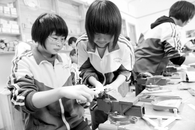 四月十五日,兴济中学的学生在学习制作木工作品。当日,山东省“中小学生综合实践一日营”活动在山东省青少年实践教育基地启动,来自济南市槐荫区兴济中学的一百七十名中学生相互配合,制作简易木制品,不仅提高了学生的动手能力,也增进了学生的互助意识。 新华社记者 范长国摄