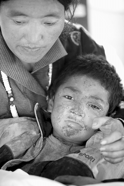 4月17日上午,从废墟中被救出的7岁小男孩彭措尼玛被送到位于玉树州格萨尔王广场的解放军536医院抗震救灾医疗队接受救治。彭措尼玛家住玉树州下拉秀乡色鲁村,地震时彭措尼玛被埋废墟,14日下午被邻居扒出。在接受救治过程中,坚强的小彭措尼玛一声不吭。随诊的彭措尼玛的姑姑连声用藏语表示:“子弟兵好比他的父母,到了这里,我们总算放心了!”