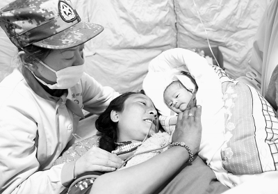4月17日,在兰州军区第四医院为玉树结古镇设置的医疗帐篷中,22岁的尕永顺利产下一名女婴,母女平安。这是医护人员在照看尕永(中)母女二人。新华社记者 李刚摄