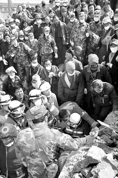 正说着,身边一位穿着印有“四川应急救援队”字样服装的中年汉子接过话题:“我们都是来自全国各地的志愿者,你看,宋志永他们是唐山来的,那边还有贵州绿丝带志愿者、中国阳光公益联盟的志愿者,都来了。我负责各地志愿者队伍在玉树灾区的各项事务。今天一早我们接到报告,这里有被压的人,这不正在清理现场,准备挖人。”
