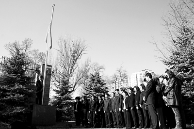 图为我驻阿拉木图总领馆全体馆员及中资机构、华侨华人、留学生代表沉痛悼念青海玉树大地震遇难同胞。 本报记者 张春友摄