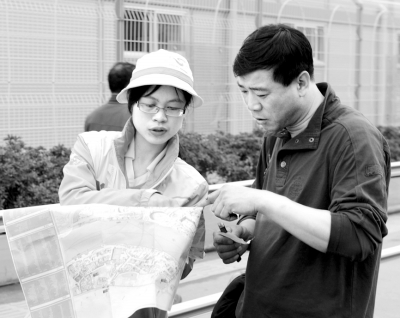 4月21日,一名园区志愿者(左)在为游客指路。新华社记者 陈树根摄