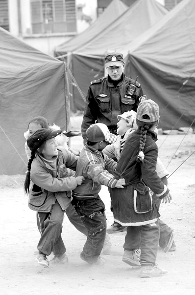 | 4月19日,在玉树民族中学操场,罗正义在和帐篷小学的学生做游戏。成都特警罗正义4月14日下午接到命令随队赴玉树震区开展救援。在15日前往玉树的大巴车上他收到妻子“顺利产下一男孩、母子平安”的短信,罗正义抵达玉树后,立即和同事们投入到救援工作中。 新华社记者 丁海涛摄 |