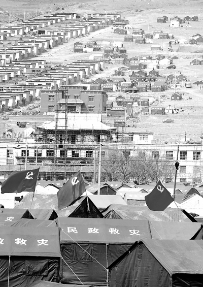 | 青海玉树地震发生后,各级政府将数万顶救灾帐篷运进地震灾区结古镇,安置灾区群众,集中连片的帐篷使雪域深处的高原重镇成为壮观的“帐篷城”。 新华社记者 侯德强摄 |