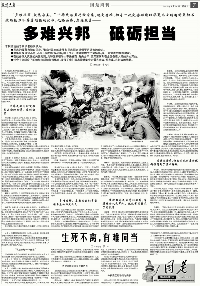 卫建国: 哪里有灾难,哪里就有解放军和武警官兵;哪里有解放军和武警官兵,哪里就有希望。这俨然成了和平年代共和国版图上一道亮丽的风景线。在革命战争年代,军人的职责是冲锋陷阵,流血牺牲;在和平年代,军人的职责和使命虽然有了极大的转变,然而凡是有困难和危险的地方,军人又总是冲在最前面。多少年来,凡是共和国发生巨大灾难,凡是人民生命财产遭受重大威胁之时,最早出现在现场并全力以赴牺牲奉献救险救灾的总是解放军和武警官兵。军民团结如一人,世界上就没有克服不了的困难,就没有战胜不了的灾害。