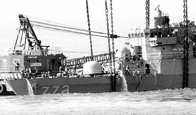 | 4月24日,在韩国白翎岛附近水域,工作人员在打捞“天安”号警戒舰舰首。 韩国军方打捞人员当日将上月沉没的“天安”号警戒舰舰首残骸打捞出水,同时找到一具遇难者遗体。一些军方官员说,以船首部分裂口形状为依据分析,外部冲击导致军舰沉没。 新华社发 |