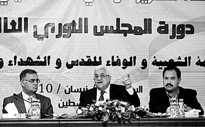 | 4月24日,在拉姆安拉召开的巴民族解放运动(法塔赫)革命委员会第三次会议上,巴勒斯坦民族权力机构主席阿巴斯(中)发表讲话。阿巴斯当天在拉姆安拉重申,巴勒斯坦坚持以“两国方案”为基础解决巴以争端,坚决反对建立一个只有临时边界的巴勒斯坦国,也反对“一个国家,两个民族”的说法。 新华社发 |