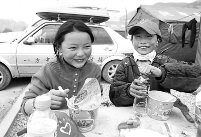| 在玉树州体育场的安置帐篷外,10岁的龚雪(左)和小伙伴一起吃饭。她是小学四年级学生,月底将在新板房复课。本报记者 高腾摄 |