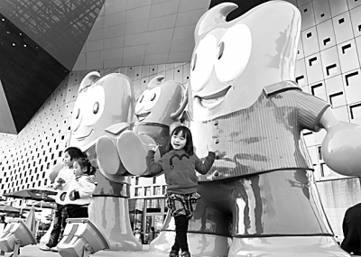 | 4月24日,几位小朋友正与“海宝一家”合影。世博会主题馆外的三座世博会吉祥物“海宝”主题雕塑活泼可爱。新华社记者 裴鑫摄 |