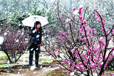 从历史记录来看,北京平原地区的终雪日期在3月中下旬,西部和北部山区在4月上旬,北京最晚的终雪日期是在5月中旬,终雪日期随海拔高度递增而推迟。八达岭长城地处军都山脉,属于区域性小气候,谷雨节气降雪虽不常见,但历史上“五一”、“十一”期间都曾有过降雪。