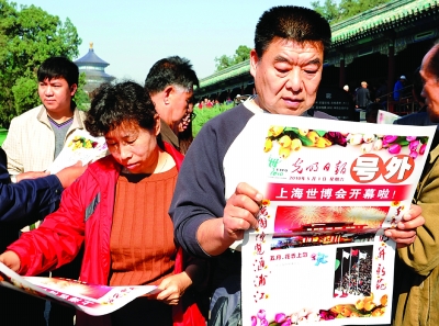 ▲5月1日上午8时,《光明日报上海世博会号外》在北京天坛公园向市民发放。