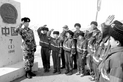 | 新疆塔什库尔干塔吉克自治县日前组织一批少先队员,来到红其拉甫边防检查连,看望被誉为“卫国戍边模范连”的叔叔们。少先队员为战士们戴上了红领巾,在界碑前上了一堂生动的国防教育课。本报记者 吴力田摄 |