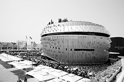 | 世博会各个场馆游人如织,丰富精彩的展览内容令游人即便要排上很久的队也要一饱眼福。图为新加坡馆外等待进馆参观的游客排起长长的队列。本报记者 刘新武摄 |