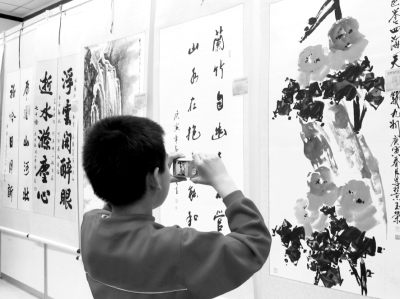 5月8日,北京大学附小余晨宇小朋友在给姥姥郭玉荣的作品拍照。当日,由中国楹联学会指导、北京神州博艺美术院主办的全国楹联书法绘画邀请展在北京大学图书馆揭幕。200余幅作品展现了楹联与书画艺术结合的独特魅力。本报记者 王国平摄