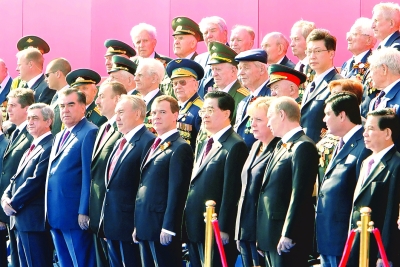 胡锦涛在参加庆典时强调,今天的和平来之不易,值得倍加珍惜。我们应该牢记历史、开创未来,树立和践行新安全观,增加相互信任,照顾彼此利益,坚持友好协商,尊重多样文明,共谋合作发展。