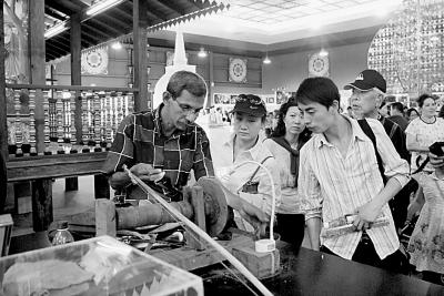 | 上海世博会期间,一些参展国带来了他们的传统工艺,为世博会增添了更多文化气息。图为斯里兰卡展馆内,参展者展示的宝石切割工艺引起了众多观众驻足观看。本报记者 李慧摄 |
