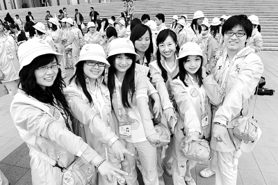 | 5月16日,接过志愿服务“接力棒”的华东师范大学同学表示他们有信心为参观者继续提供热情周到的服务。当日,上海世博园区首批来自复旦大学、同济大学的青年志愿者集体卸任。 新华社记者 李紫恒摄 |