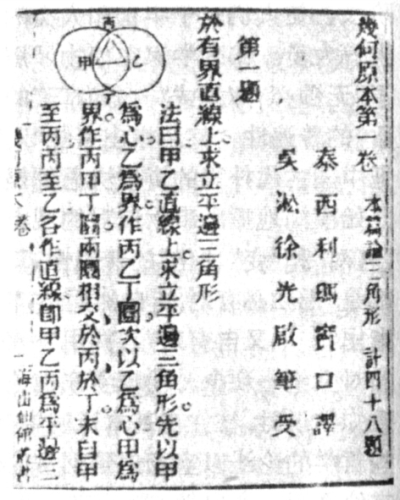 曹操《短歌行》:“对酒当歌,人生几何?”徐光启、利玛窦借用“几何”二字,重新命名“形学”,谐音英文Geo,促使中国这门学科与西方接轨。梁启超在《中国近三百年学术史》中,盛赞“利、徐合译之《几何原本》,字字精金美玉,为千古不朽之作”,又称四库全书馆臣多嗜算学,“在科学中此学最为发达,经学大师差不多人人都带着研究”。其影响之大,刺激了后来的墨学、尤其是蕴含科学和逻辑思维的“墨辩之学”的复兴。只可惜当时的体制不能使科学研究与创造发明相结合,众多的聪明才智依然浪掷于以八股求利禄之中,因而无法打通中国的工业化进程。《四库全书》的价值系统只把天文算法类的《几何原本》等书作为一家之言置于副册,没有将之作为正册的独立的科学体系而置于国家文化的正统地位。社会机制不能互动互融而出现文化脱层现象,乃是一个大国全面协调发展的大忌。