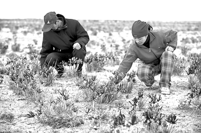 上图:5月16日,一场阵雨过后,内蒙古鄂托克前旗上海庙镇白对花、郝志海夫妇在自家草场上把草籽按入潮湿的沙中。毛乌素沙漠的鄂托克前旗2009年植被覆盖度和森林覆盖率达到81%和15.4%。体现绿色生机的马兰花成片开放。(本报记者程伟光、高平摄影报道)