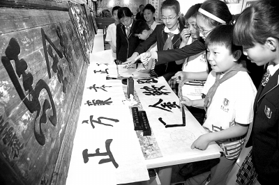 北京市史家小学日前联合首都博物馆、科举匾额博物馆将部分藏品请进校园,让学生利用博物馆感受和学习传统文化。本报记者 赵洪波摄