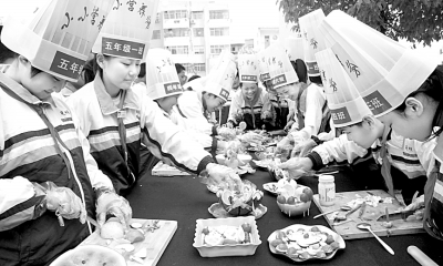 5月19日,枣庄市市中区光明路小学的学生制作拼盘。学生们不仅参赛制作水果、蔬菜拼盘,还要说出拼盘的营养价值,通过比赛活动学习营养知识。