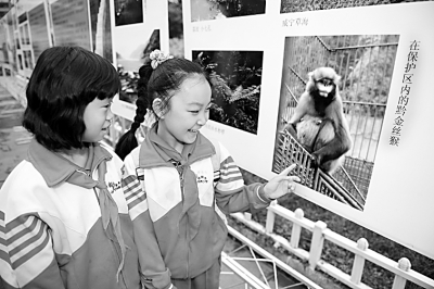 上图:贵州启动“2010国际生物多样性年贵州行动”,5月22日,两名小学生被黔金丝猴的照片吸引。 新华社记者 刘续摄