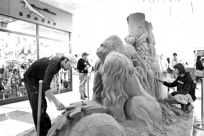5月24日,在捷克首都布拉格莱特纳尼商贸中心内购物区,两位来自荷兰的沙雕艺术家在制作题为《热带丛林》的大型沙雕。沙雕作品具有独特的艺术魅力和强烈的视觉冲击力。在创作沙雕的过程中,只能用沙和水为材料,不允许使用任何化学黏合剂。由于沙雕会在一段时间内自然解体,不会造成任何环境污染,因此被称为“绿色的大地艺术”。 本报记者 夏茂盛摄