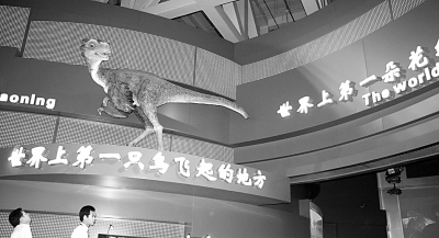 在辽宁馆里记者发现,像中华龙鸟这样价值连城的化石共有10块,中华龙鸟(正模、负模)、顾氏小盗龙、邹氏尾羽龙、贺氏近鸟龙、圣贤孔子鸟、攀援始祖兽、辽宁古果、中华古果,个个都是大明星,每一块都是绝版。其中,辽宁古果化石发现于1998年,发现地也是辽宁北票地区。它的知名度丝毫不亚于中华龙鸟化石,不止一次登上过美国《科学》杂志的封面,并被称为“迄今世界上有确切证据的最早的花”。