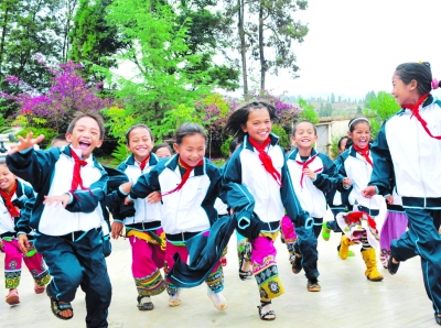 五月二十九日,族小学生们穿上新校服在校园里奔跑。 当日,云南省地板商会的一些会员,专程来到石林彝族自治县长湖镇贫困山区的彝族村寨黑豆村,为当地小学的一百多名彝族小学生赠送儿童节礼物──校服,结束了该校学生没有校服的历史。新华社记者 陈海宁摄