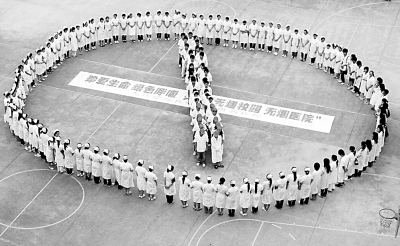 400名大学生拼出“禁止吸烟”的图案。在5月31日世界无烟日来临之际,江西九江学院医学部、附属医院的大学生和医护人员发出“珍爱生命,绿色呼吸”的倡议。