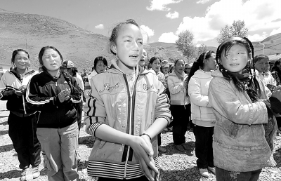 5月29日,11岁的扎西文毛(前)和同学们一起排练歌曲《玉树花开》。当日,青海省玉树藏族自治州孤儿板房学校100多名学生在志愿者老师的带领下排练合唱节目,准备在“六一”儿童节期间演出。 新华社记者 张宏祥摄