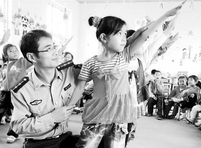 | “六一”国际儿童节来临之际,山东潍坊边防支队羊口边防派出所官兵与驻地幼儿园师生开展了“大手牵小手,共庆儿童节”活动,幼儿园里充满了欢声笑语。 本报通讯员 尹涛涛摄 |