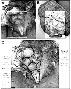 苏克和塔玛尔戈花费了4年时间对此进行研究。他们将人类大脑解剖图像和画中上帝颈部的画面重叠对比,出乎意料地发现两者的轮廓竟然惊人地相似!上帝喉咙处凸出的部分就像延脑椎体,而喉咙上部的肌肉则像脑桥。(见图1)画中上帝所穿长袍上的腰带呈现出来的奇特线条,则代表了人类的脊骨。两位医生认为,米开朗基罗有意通过略显拙劣的笔触,引导人们发现他在壁画中隐含的解剖学知识。这一研究成果在今年5月最新一期的《神经外科学》杂志上发表后迅速引起人们的关注,米开朗基罗和他的《创世纪》也再度笼罩上神秘的色彩。