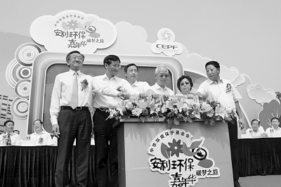 图为安利(中国)总裁黄德荫(左一)和中华环保基金会理事长曲格平(右三)等共同启动“碳梦之旅”嘉年华之旅。