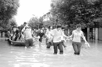 从洪水进入校园的那一刻起,副县长陈正平带领电力、林业、公安、城市管理执法、交警、人武部400多名党员干部在考点外守候,考试一结束,干部、干警们就甘当人梯,将学生一个一个的背出考点。但由于水势上涨迅猛,12时30分,学校外街面的水位淹至齐肩处,靠人力无法转移。该县立即召集县人武部4个应急分队,用救生艇转移被困楼上的100多名学生,至下午14时左右救出,全校756名考生全部安全转移。
