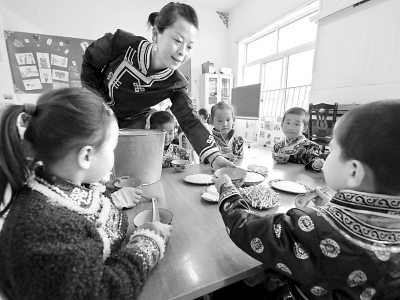 内蒙古自治区鄂尔多斯市的蒙古族学生从今年起可享受19年免费教育,即从上幼儿园起直至大学毕业。图为学生们在领取营养配餐。