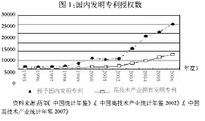近年来,国家不断加大对科技的投入,R&D占GDP的比重逐年增加。按照《国家中长期科学和技术发展规划纲要》的要求,到2020年这一比例将达到2.5%,赶上或接近发达国家的水平。1995年以来,我国国内发明专利授权数逐年增加,其中高技术产业拥有的发明专利占了很大比例((图1))。
