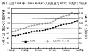 根据国际经验和相关研究,从事R&D 的人员总量与GDP增长呈正相关关系。这一方面说明,研究开发人员作为生产力要素支撑着GDP的增长;同时也说明,研发人员的规模是决定GDP增长的关键因素之一。科技部“人才战略”课题组分析显示,自80年代以来,美国的R&D人员总量与GDP的增长具有良好的正相关(图2)。