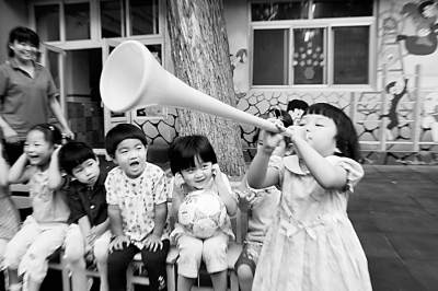 6月11日,北京市朝阳区新世纪幼儿园的老师找来足球、吉祥物和大喇叭等与世界杯有关的实物,为小朋友介绍世界杯的知识。图为小朋友吹响了极具南非特色的加油工具大喇叭“呜呜嗞喇”(Vuvuzela)。