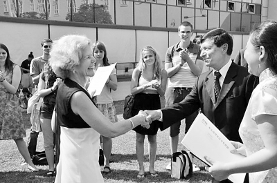 为期2天的“维也纳大学孔子学院开放日”6月12日结束。开放日期间,许多奥地利人顶着摄氏35度的炎热,来参加中医咨询、品茶、中国书法、学汉语、武术表演、看中国电影等活动。孔子学院学生施拉瓦斯科女士此前以197分的成绩(满分为200分)通过了国家中级汉语水平考试。图为孔子学院院长李夏德教授在“开放日”上向她颁发证书。本报记者 方祥生摄