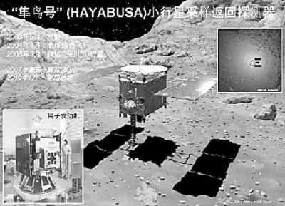 曾多次在太空中失踪但又重新与地球取得联系、曾多处损坏但又奇迹般地被修复的日本隼鸟号小行星探测器13日晚终于结束其长达7年的太空旅行回到地球。尽管探测器的主体已在进入地球大气层时燃烧殆尽,但探测器的密封舱在澳大利亚南部的沙漠中成功降落,日本宇宙航空研究开发机构(AXA)已对其进行回收并打算尽快运回日本。预计到今年9月就可以得知密封舱是否运回了一个名叫丝川的小行星上的沙土。