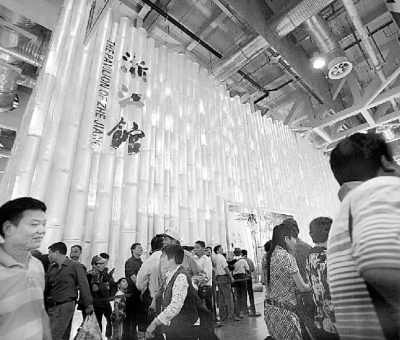 料和照明装置加工而成的“竹子艺术品”将浙江馆包裹成“竹立方”。令人称奇的是,这竹子还会变色,一会儿翠绿,一会儿淡灰,把江南的柔美色调都揉入灯光,带来晶莹剔透、清新高雅的视觉享受。
