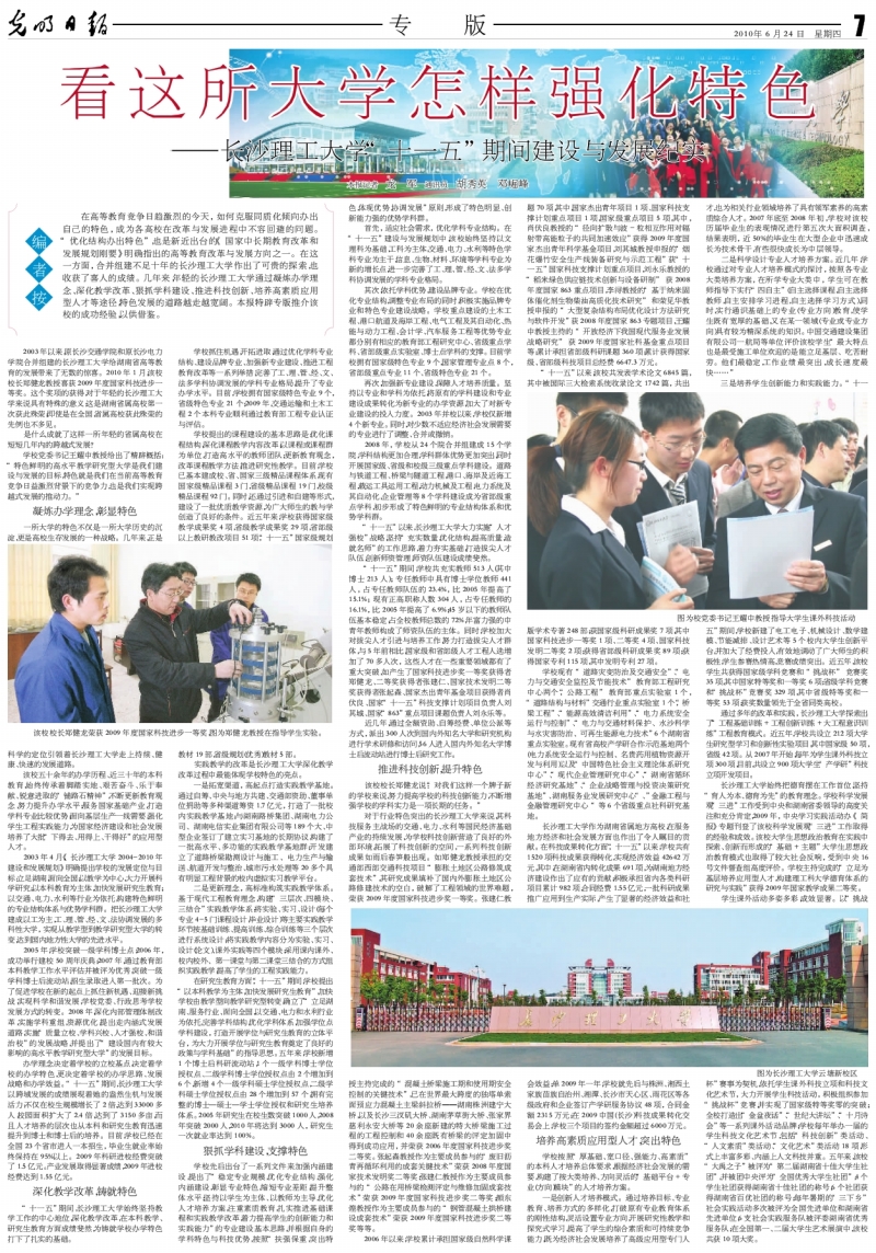 编者按 在高等教育竞争日趋激烈的今天,如何克服同质化倾向办出自己的特色,成为各高校在改革与发展进程中不容回避的问题。“优化结构办出特色”,也是新近出台的《国家中长期教育改革和发展规划刚要》明确指出的高等教育改革与发展方向之一。在这一方面,合并组建不足十年的长沙理工大学作出了可贵的探索,也收获了喜人的成绩。几年来,年轻的长沙理工大学通过凝炼办学理念、深化教学改革、狠抓学科建设、推进科技创新、培养高素质应用型人才等途径,特色发展的道路越走越宽阔。本报特辟专版推介该校的成功经验,以供借鉴。