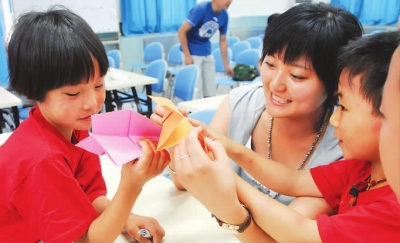 6月23日,中华少年慈善救助基金会的矫翠萍(左二)在帮助孩子们念出纸飞机上的祝福。当天,在主题为“放飞梦想”的科普教育活动上,13名来自玉树灾区的孩子和北京的小学生们共同制作飞机模型并进行放飞活动。(新华社记者 王建华摄)