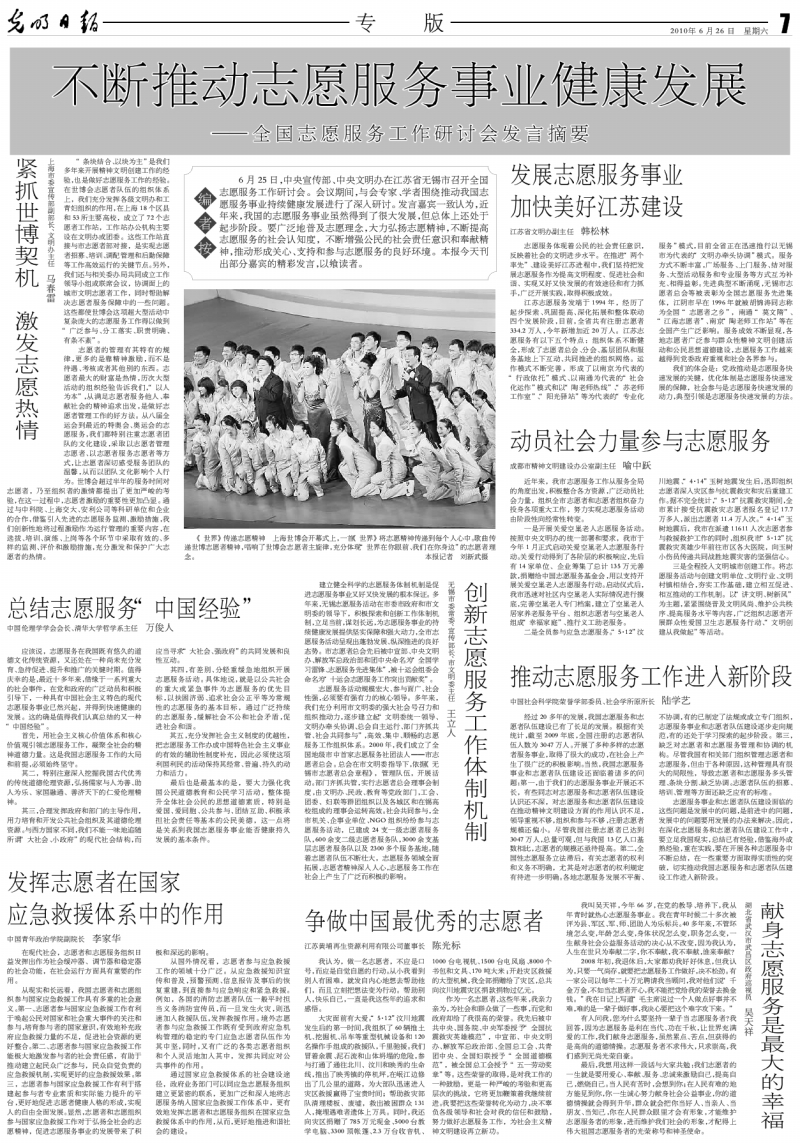 编者按 6月25日,中央宣传部、中央文明办在江苏省无锡市召开全国志愿服务工作研讨会。会议期间,与会专家、学者围绕推动我国志愿服务事业持续健康发展进行了深入研讨。发言嘉宾一致认为,近年来,我国的志愿服务事业虽然得到了很大发展,但总体上还处于起步阶段。要广泛地普及志愿理念,大力弘扬志愿精神,不断提高志愿服务的社会认知度,不断增强公民的社会责任意识和奉献精神,推动形成关心、支持和参与志愿服务的良好环境。本报今天刊出部分嘉宾的精彩发言,以飨读者。